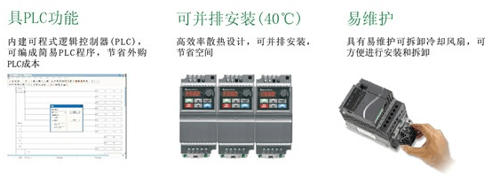 本系列采用彈性模塊的設計,特色是內置PLC功能,可編寫簡易程序儲存與執(zhí)行;并可外加特殊功能擴展卡及通訊卡,是小馬力型的代表,滿足業(yè)界多元化的需求。